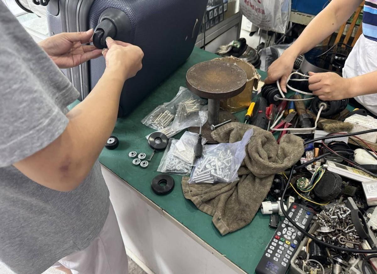 冯师傅正在修理一个旅行箱的轮子。人民网记者 龚莎摄