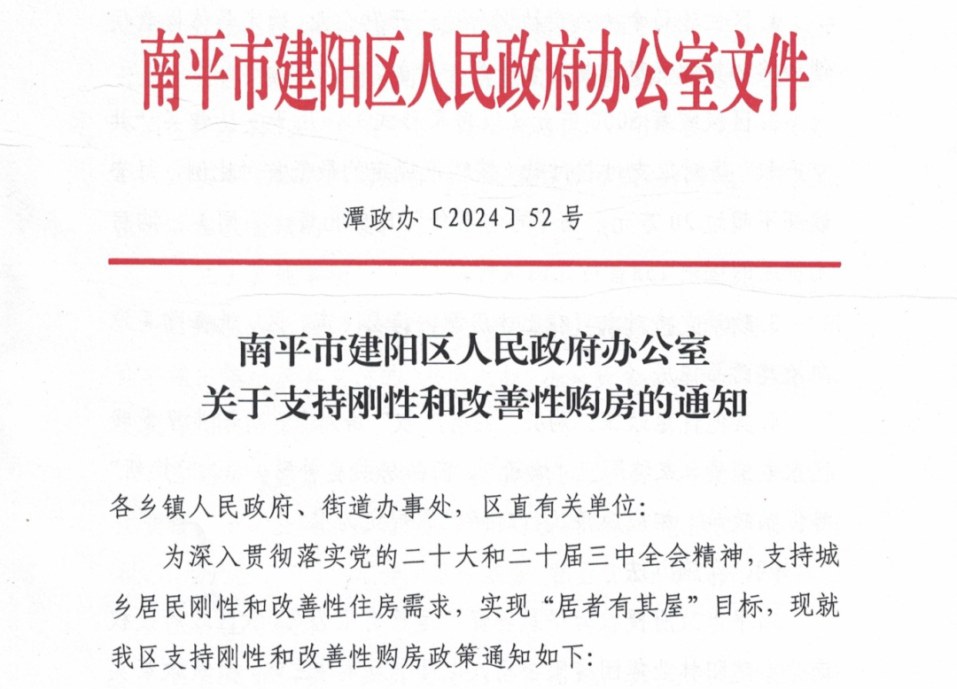 党的二十届三中全会和省委全会提出,加快构建房地产发展新模式;南平市委六届七次全会也提出,要因城施策优化调整房地产调控政策,支持城乡居民多样化改善住房需求,探索“共有产权”等模式。为贯彻落实三中全会精神,近期从中央到地方陆续出台了下调首付比例、再次降低贷款利率、支持收购房企存量土地等一系列政策“组合拳”,促进房地产市场平稳健康发展。