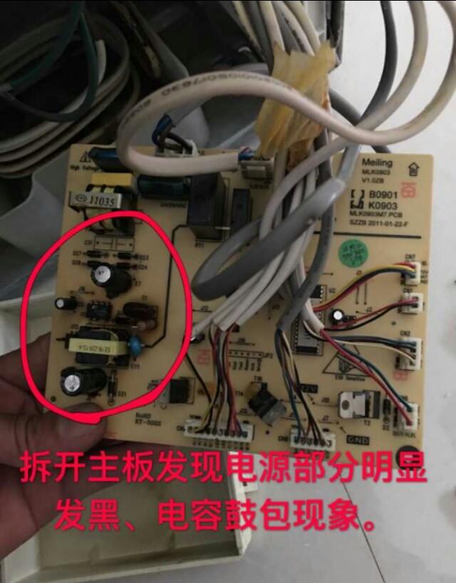 拆开电器盒露出主板,发现主板的电源部分有明显发黑及电源鼓包现象。