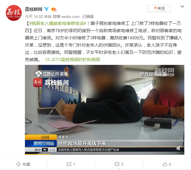 【#独居老人慎接家电维修电话#!骗子假扮家电维修工 上门修了3样电器收了一万四】近日,南京78岁的李奶奶接到一个自称商场家电维修工电话,称对顾客家的电器做上门维保。对方半小时维修了3样电器,竟然收费14000元。民警找到了嫌疑人许某,没想到,这是个专门针对老年人的诈骗团伙。许某承认,老人孩子不在身边,比较容易骗钱。民警提醒,子女平时多给老人们普及一下防范诈骗的知识,避免被骗。