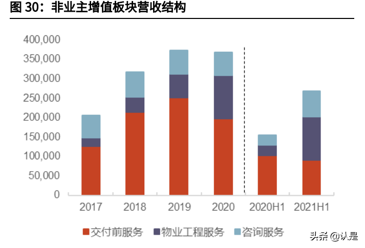 2020 年,公司非业主增值服务营收达到 3.7 亿元,较 2019 年稍有下降,主要是 因为 2020 年上半年的疫情影响客户运营情况,导致部分物业开发项目的建设、 销售和营销活动及交付有所延迟,致使营收下降 1.3%。将该板块的营收细化拆 分来看,交付前服务、物业工程服务和咨询服务的营收占比分别为 53.7%、30.4% 和 15.9%,物业工程服务板块营收占比有明显增长。