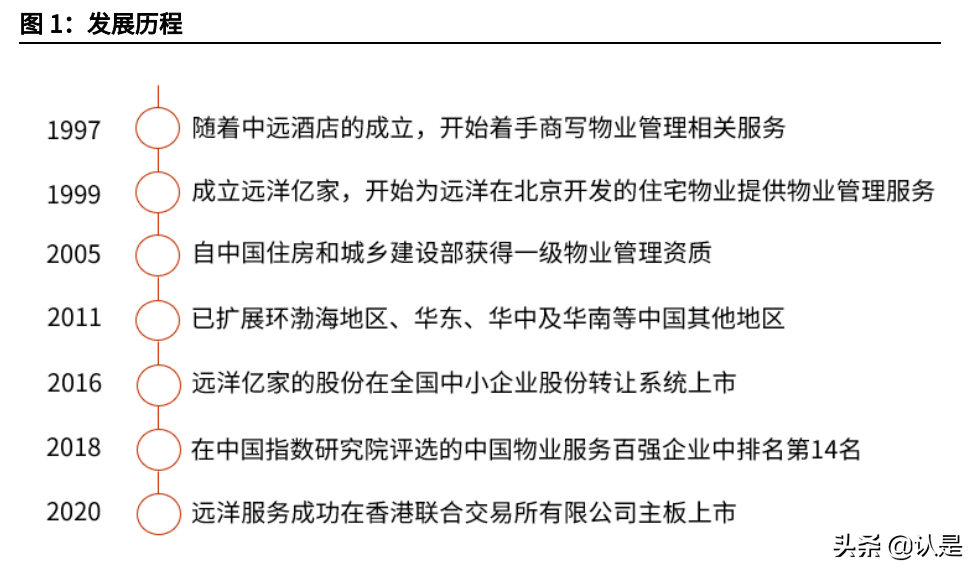 1997 年,随着中远酒店的成立,公司开始着手为商写物业(如办公楼宇)提供 物业管理相关服务;1999 年,远洋亿家成立,开始着手为远洋在北京开发的住 宅物业提供物业管理服务;2005 年,远洋亿家自中国住房和城乡建设部获得一 级物业管理资质;2011 年,远洋亿家已扩展至环渤海地区、华东、华中及华南 等中国其他地区;2016 年至 2018 年,远洋亿家的股份在全国中小企业股份转 让系统上市;2018 年,按整体实力计,远洋亿家在中国指数研究院评选的中国 物业服务百强企业中排名第 14 名;2020 年,远洋服务控股有限公司即远洋亿家 物业在香港联合交易所主板挂牌上市。