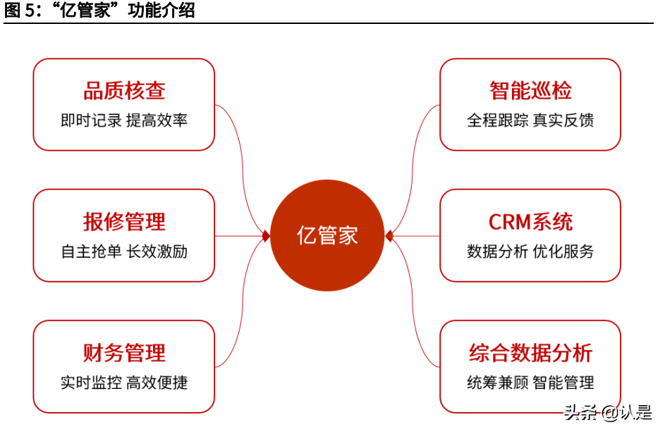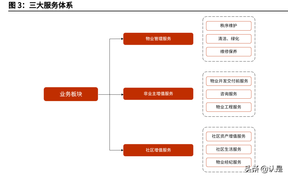 1)社区资产增值服务:主要包括停车场管理服务、能源管理服务以及社区空间 营运服务; 2)社区生活服务:主要包括新房拎包入住、家政和清洁、家用电器及设备的维 修保养、团购、餐饮等服务; 3)物业经纪服务:主要包括提供房产咨询、房屋转让及租赁、车位租售服务, 解决业主闲置资产的处置需求。(报告来源:未来智库)