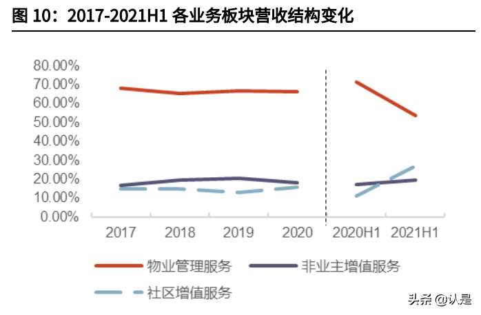 公司逐渐将发展重点转移至高利润率的社区增值服务,围绕业主日常生活,不断 拓宽增值服务边界,对接客户需求,深挖可经营资源,全面提升项目效益。 2017-2021H1,物业管理服务板块营收占比自 68.4%下降至 53.8%;非业主增 值服务板块营收占比自 16.9%增长至 19.4%;社区增值服务板块营收占比自 14.7%提升至 26.8%。