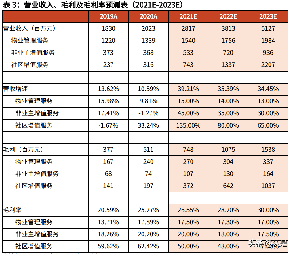 非业主增值服务板块 2020 年毛利率为 20.2%,考虑到 2021 年下半年起新房销 售逐渐走弱,竣工增速回落,导致非业主增值服务中交付前服务收入占比降低, 毛利率较低的物业工程服务收入占比增加,在此趋势下我们预计 2021 年板块毛 利率将小幅下行;预测该板块 2021-2023 毛利率为 20.0%、18.0%、17.5%。