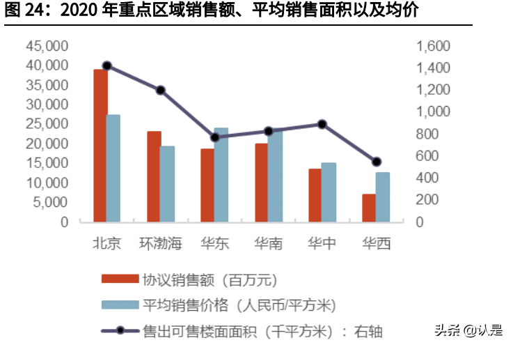 2020 年,远洋集团在北京、环渤海、华东、华南、华中及华西的销售额占比分 别为 21%、13%、29%、16%、14%、7%;其中北京销售规模达到 388.8 亿元, 平均售价 27300 人民币/平方米。展望未来,远洋集团将继续贯彻落实“南移西 拓”的战略布局,维持均衡搭配的项目组合,降低个别城市市场波动的风险。(报告来源:未来智库)