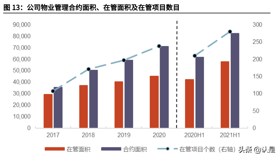 从合约面积和在管面积来看,公司管理面积规模高质量增长。2017-2020 年,公 司合约面积从 0.36 亿平米增加至 0.71 亿平米,三年复合增长率约为 25.4%;在管面积从 0.29 亿平米增加至 0.45 亿平米,三年复合增长率约为 15.8%。公司 合约/在管面积覆盖倍数持续保持高位,截至 2021H1,合约面积是在管面积的 1.43 倍,可以有力保障公司未来物业管理服务板块的收入增长。