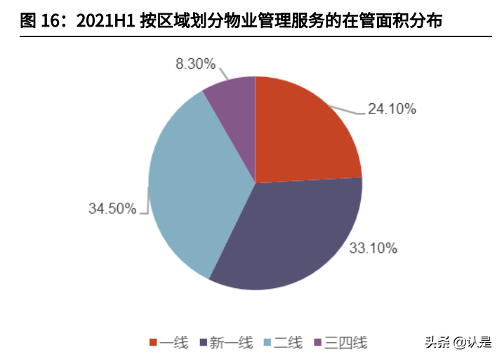 公司的在管面积按区域拆分来看,截至 2021H1,公司京津冀地区、环渤海地区、 华东地区、华南地区和华中及华西地区的在管面积分别为 1771 万平米、1666 万平米、822 万平米、830 万平米、691 万平米,占比分别为 30.6%、28.8%、 14.2%、14.4%、12.0%。远洋服务区域布局集中在一二线核心城市,在管建筑 面积中,一二线城市占比达到 92%,为公司发挥规模优势、优化服务品质提供 了良好的基础。