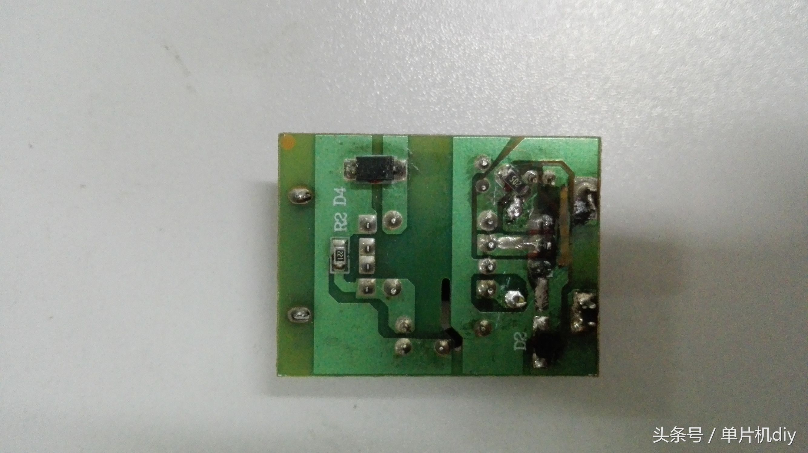 今天我就以坏掉的手机充电器为例,给大家讲解一下,这个坏掉的充电器应该属于工作时电流过大,把PCB上的焊锡都已融化,还导致了某些元件直接烧掉,先来看下烧掉的充电器图片。
