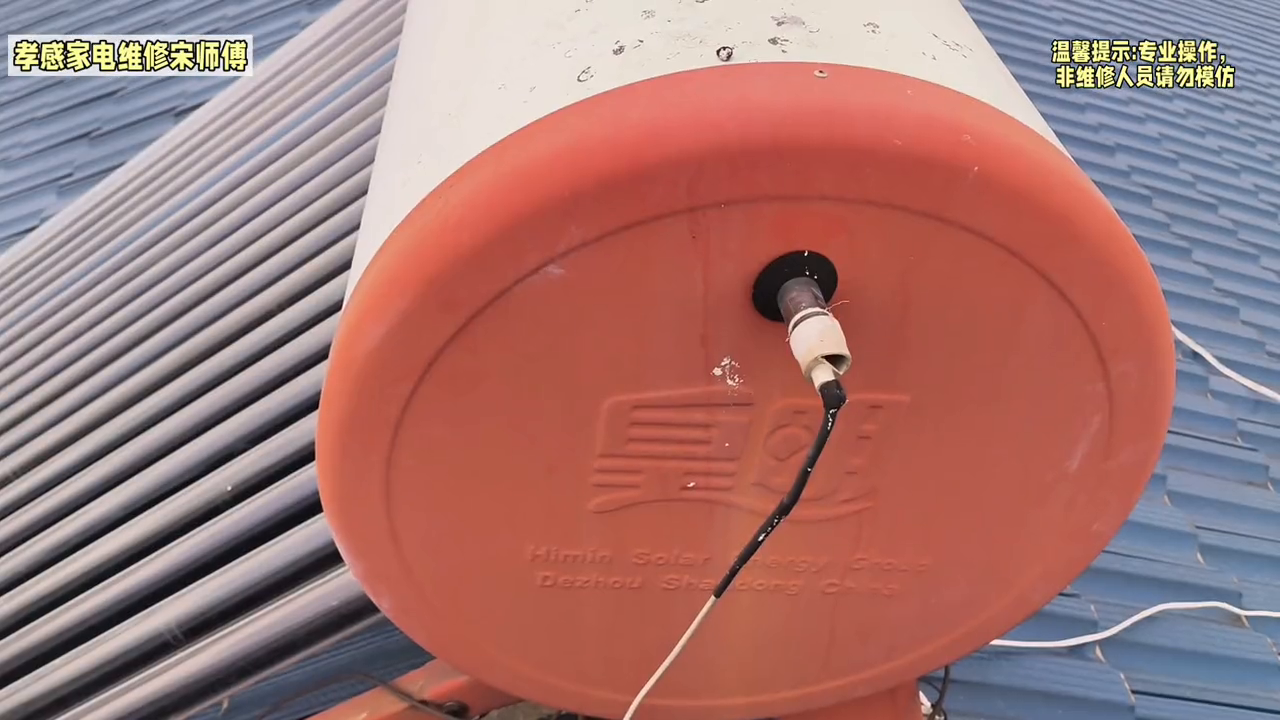 这一台是客户家的,看这个瓦面都是琉璃瓦,容易滑倒,所以非维修人员请勿模仿。这个是太阳能的传感器,现在把传感器拔出来,找来了一个同型号的传感器,都是两芯的,这两根线是不能接反的,如果接反水位和温度显示是不准的。