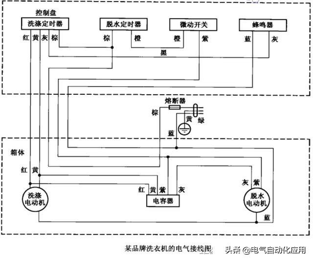 下图所示是某品牌洗衣机的电气接线图。通过该图可以看出洗涤电动机、脱水电动机、电容器(运转电容)、定时器和控制开关的安装位置以及它们之间的接线情况,这对电器的安装和维修有很大的帮助。 三、强电电路图的识图方法