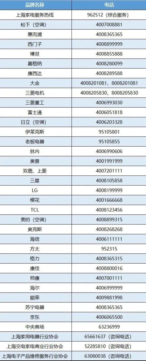 一要从权威渠道寻找品牌厂家电话,包括12345市民热线、12315消保委热线和网站、市商务委官网以及962512上海家电服务热线和网站,有关家电行业协会咨询电话(上海家用电器行业协会:65661637/上海交电家电商业行业协会:52285810/上海电子产品维修行业协会:63080038)等。不要简单地从搜索引擎网络和信箱小广告中查找。
